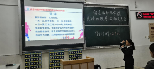 (通讯员/李秀文)为提高同学们英语四级备考效率,增强考试信心,11月17日下午,在西校区五教115室,申搏举行英语四级考试动员大会。本次大会旨在为学生提供考前辅导,分享备考经验,进行集体宣誓,激发同学们的学习热情和考试斗志。外国语学院陈琳琳老师、辅导员吴朝晖老师以及一年级高英班全体学生参会。
