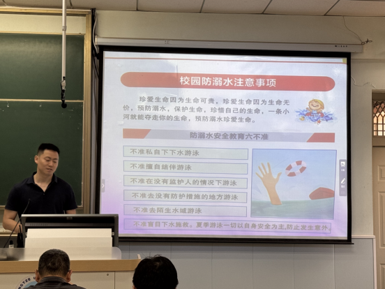 会上,黄何围绕溺水危害、事故现状、预防原则及急救技能展开讲解。他首先阐释溺水的定义,说明其分为干性与湿性两类,强调溺水者因呼吸受阻无法呼救、挥手,常呈现动作异常、反应迟缓等隐蔽状态,提醒大家警惕“看似正常”的危险情形。