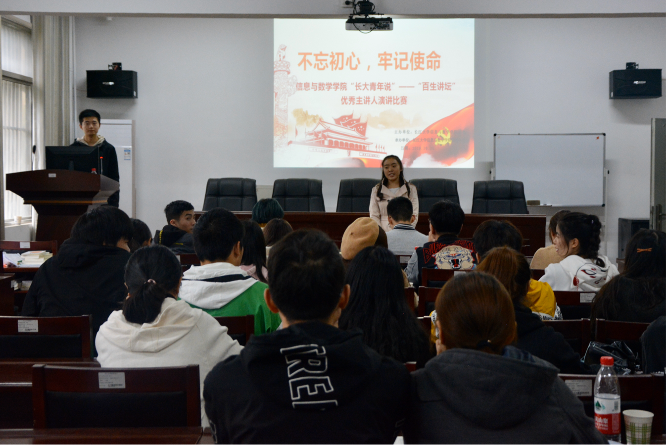 此次演讲比赛以“不忘初心,牢记使命”为主题,旨在向全体团支部成员传达习近平新时代中国特色社会主义思想和党的十九大精神。共有七位来自不同班级的学生参与比赛,他们依次上台通过“主题演讲”和“学习一点通”方式分享了学习体会和感悟。其中来自信计11802班的选手曹争以“牢记四进四信,引领中国未来”为主题赢得本次比赛的“优秀主讲人”称号。她向观众分享了她对理想的解读,从何为四进四信出发,由自身学习生活体会过渡,以习近平总书记对新时代青年的嘱托作结,发出“接过中国未来,吾辈,领命!”的宣誓,激励着新时代青年不忘初心,奋发前行。演讲过后便是活力团支部答辩环节。在多媒体的辅助下,信计11802班向大家展现了全体成员的精神风貌和支部建设的特色与亮点,体现了支部的学习认同和实际成效。最后,参赛选手和与会成员合影留念,本次演讲比赛圆满结束。