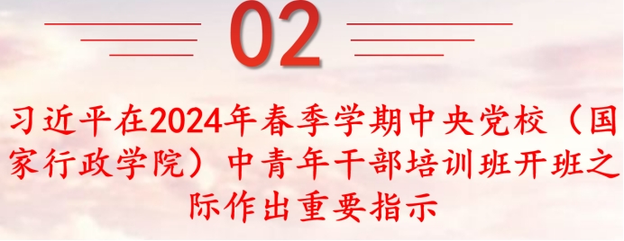 2024年春季学期中央党校(国家行政学院)中青年干部培训班3月1日上午在中央党校开班。中国中央总书记、国家主席、中央军委主席习近平作出重要指示强调,年轻干部是党和国家事业发展的主力军,是中国特色社会主义事业的接班人。新征程上,年轻干部重任在肩、大有可为,必须牢记初心使命、顽强拼搏进取,奋力跑好历史的接力棒。