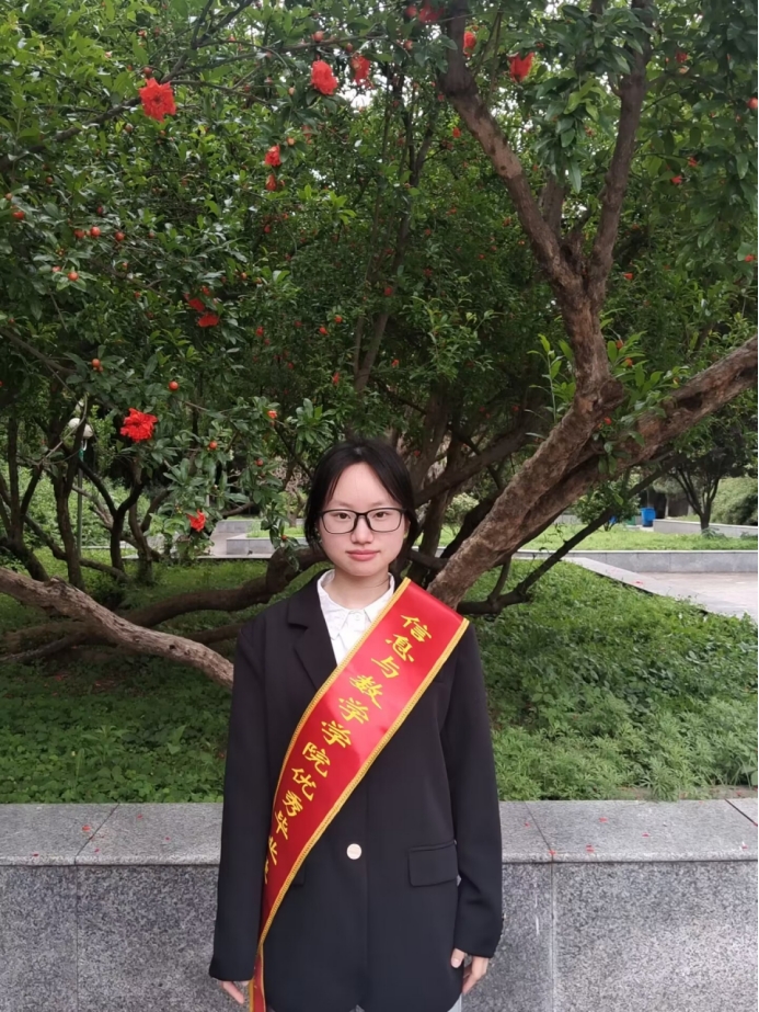 出于对数学的热爱,她始终刻苦钻研,勤奋好学,在各方面取得优异的成绩。自大二至大四一直担任班级组织委员,曾任院学生会组织部干事;积极参加志愿服务,如校园垃圾清理活动,成为了一名光荣的注册中国志愿者;一次性通过全国大学生英语四级和六级考试、高中数学教师资格考试、普通话考试,并获得普通话二级乙等证书;参加并完成国家大学生创新创业训练计划项目1项;曾获全国大学生数学建模竞赛湖北省一等奖、全国大学生市场调研与分析大赛湖北省一等奖;曾获评“优秀共青团员”1次、学校“三好学生”1次、学校“优秀实习生”1次、学院“三好学生标兵”1次;曾获国家奖学金1次、sunbet申搏官方网站奖学金3次;现已推免至电子科技大学攻读硕士研究生。