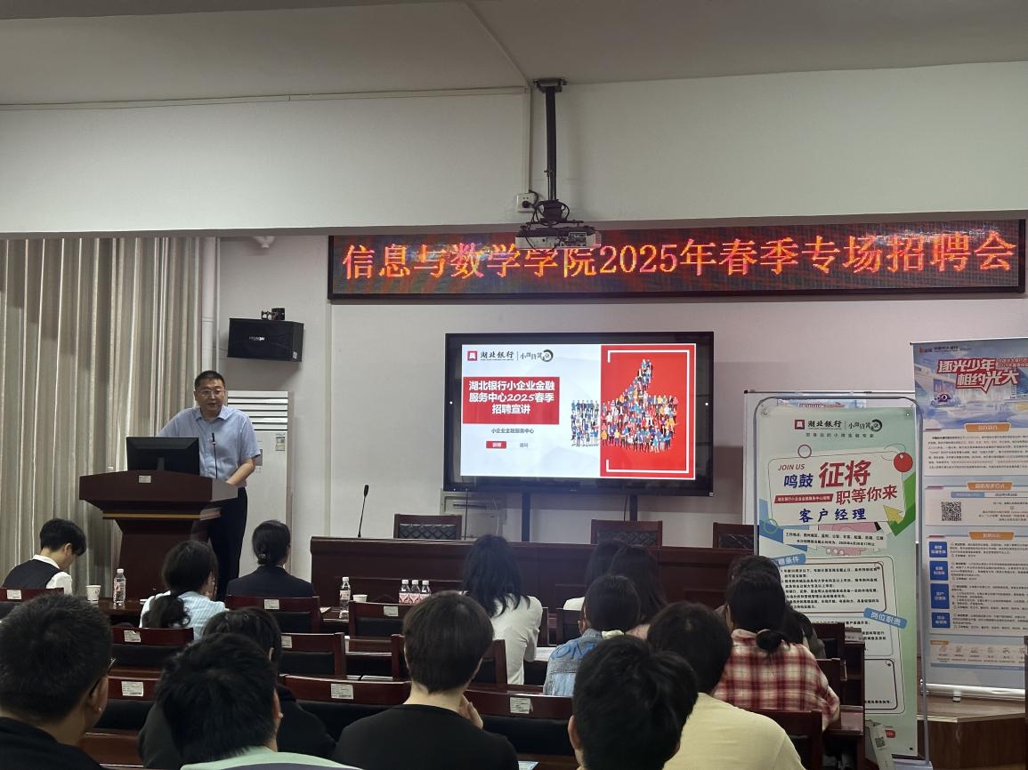 (通讯员 于志浩)4月11日下午,申搏在8教406会议室举办春季专场招聘会,搭建供需桥梁,推送人才与企业精准对接,吸引了大量应届毕业生踊跃参加。此次参加招聘的单位有工商银行、光大银行、湖北银行、沙市七中、沙市一中、公安博雅中学、安良百货有限公司、瑞丁文化传播有限公司、荆州市华川计算机科技有限公司等。