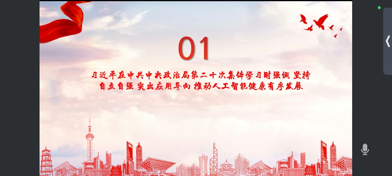 会上,同学们重点学习了习近平总书记关于教育的重要论述以及在中央民族工作会议上的重要讲话精神。习近平总书记的重要讲话为教育事业的发展指明了方向,强调了教育在国家发展中的重要地位和作用。同时,同学们还学习了关于加强人工智能发展和监管的相关内容,领会到我国推动人工智能朝着有益、安全、公平方向健康有序发展的决心,以及发挥新型举国体制优势、坚持自主创新的重要意义,激发了大家在专业学习中探索科技前沿、投身创新实践的热情。