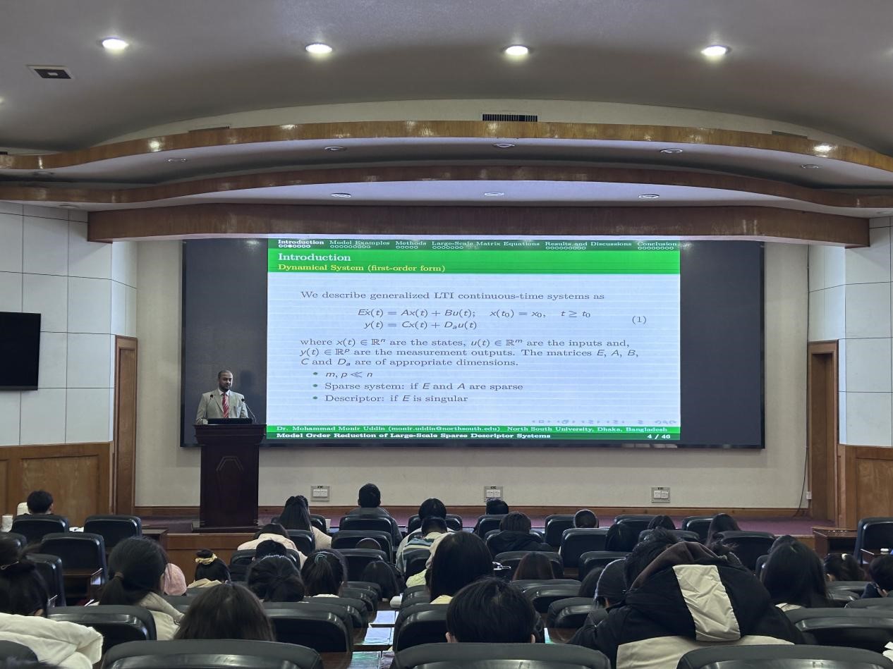 2023年12月25日,孟加拉国南北大学数学和物理系教授Mohammad Monir Uddin应邀访问申搏,在11教学术报告厅为学院师生作了题为“Model Order Reduction of Large- Scale Sparse Descriptor Systems(大规模稀疏描述系统的模型降阶)”的学术报告,报告由院长张涛主持。sunbet申搏官方网站的青年教师、研究生和本科生参加了本次学术报告会。
