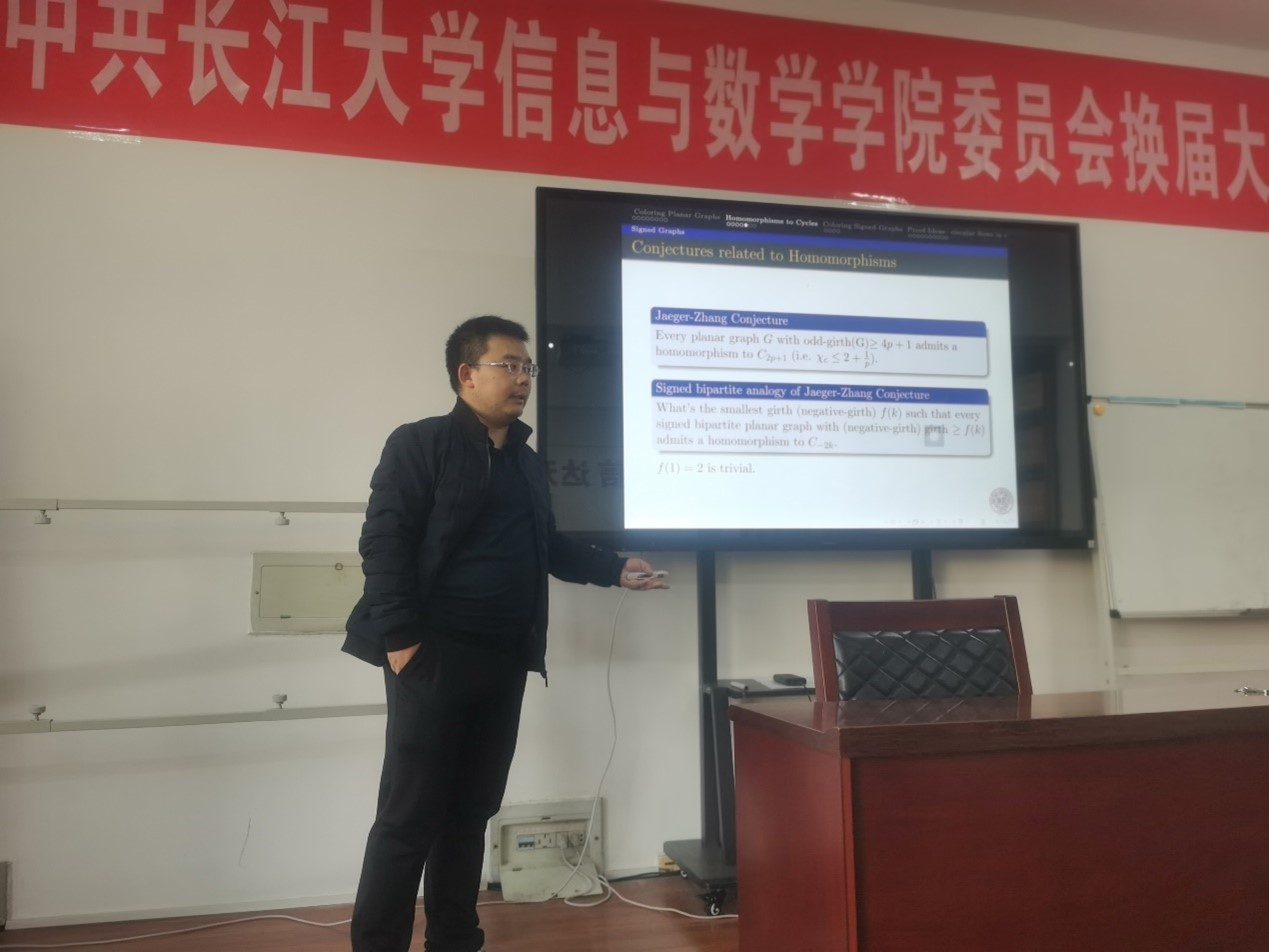 2023年12月1日,南开大学数学科学学院李佳傲教授应邀请访问申搏,在8教406报告厅为学院师生做了题为“ Circular flows in mono-directed signed graphs— a dual concept of circular coloring”的学术报告,报告由副院长李向军主持。sunbet申搏官方网站应用数学专业的部分教师和硕士研究生参加了本次学术报告会。
