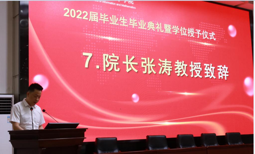 毕业典礼最后,院长张涛致辞。他从坚持修身、坚持学习、坚持梦想、敢于担当四方面与2022届全体毕业生共勉,希望大家逐步形成时代所需的价值观和优良品质,成为人格健全、灵魂高尚、意志坚定且具有强烈使命感和民族文化之根的新时代大学生。