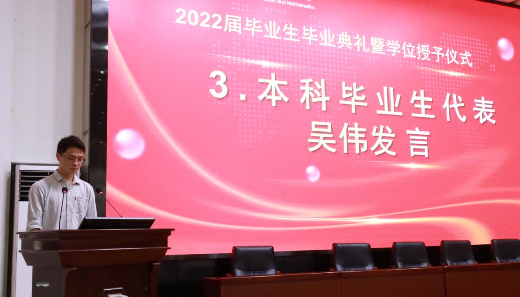 吴伟代表本科毕业生进行发言。他真诚地表达了对母校和老师的感激之情,更表达了对学院的感恩之情。