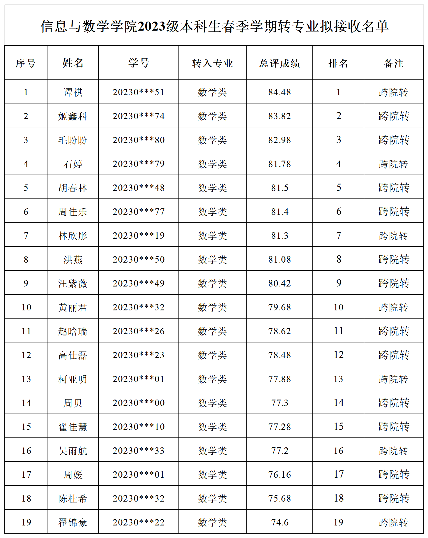 根据《sunbet申搏官方网站普通本科生专业分流与转专业管理办法(试行)》(长大校发〔2019〕260号)精神,按照《关于开展2023级普通本科生春季学期转专业工作的通知》和《sunbet申搏官方网站2023级普通本科生转专业考核工作方案》要求,经学生本人申请,学生所在学院和本科生院资格审核,申搏对拟转入学生进行了面试考核。现将sunbet申搏官方网站2023级本科生春季学期转专业拟接收名单予以公示。