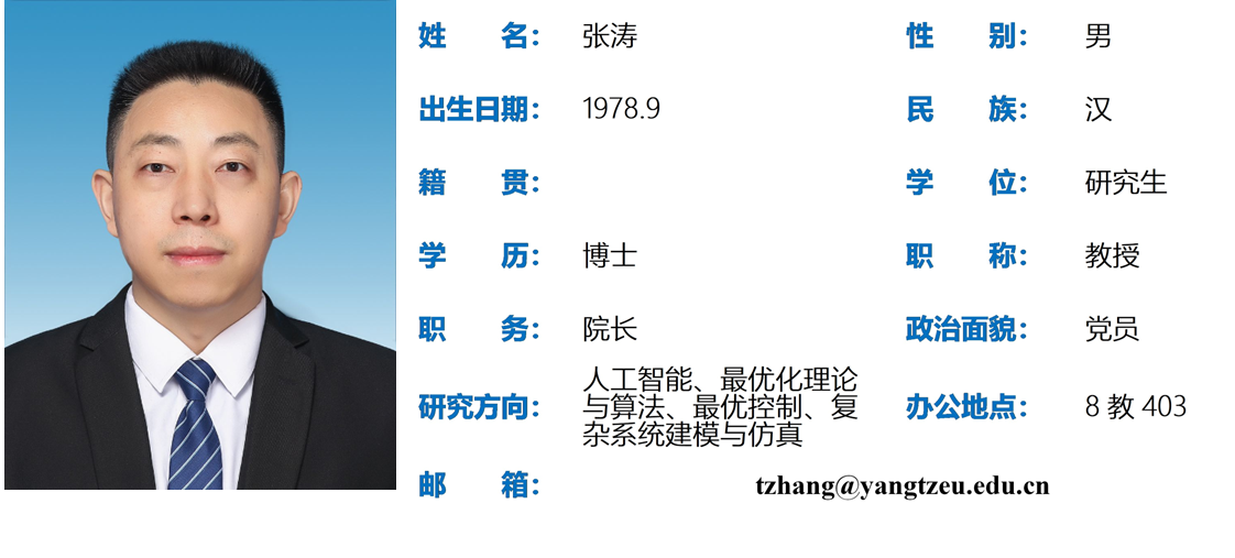 张涛,男,1978年9月生,博士,教授,博士生导师,现任sunbet申搏官方网站院长。2014年6月博士毕业于武汉大学系统工程专业。2017.9-2018.9,美国德州农工大学访问学者。湖北省系统工程学会常务理事,湖北省数学会理事。