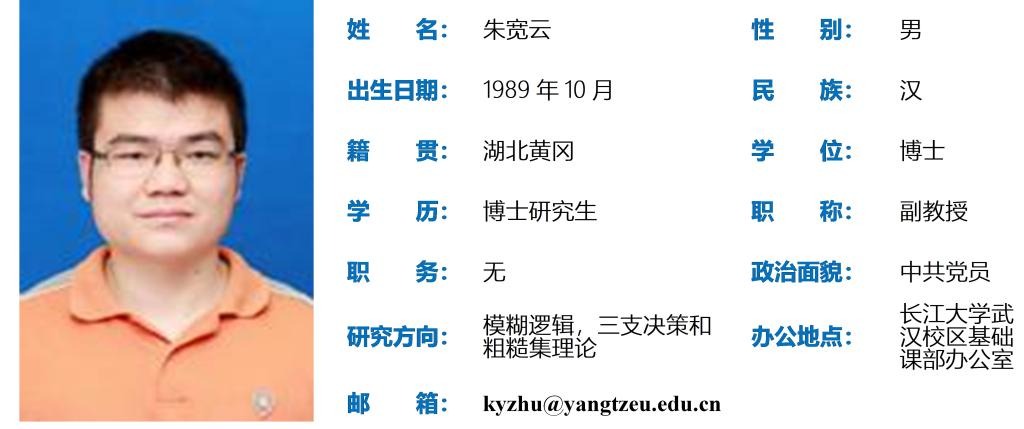 朱宽云,男,1989年10月出生,博士研究生,副教授。主要从事模糊逻辑、三支决策和粗糙集理论研究。2019年6月毕业于武汉大学数学与统计学院,同年7月入职sunbet申搏官方网站。以第一作者(或通讯作者)公开发表SCI/EI论文50余篇,其中包含《Fuzzy Sets and Systems》、《Information Sciences》、《Soft Computing》、《Journal of Intelligent & Fuzzy Systems》、《Journal of Multiple-Valued Logic & Soft Computing》以及《International Journal Machine Learning and Cybernetics》。尤其是近几年来以第一作者连续在SCI数学类一区Top期刊《Fuzzy Sets and Systems》(IF:3.9)上发表7篇论文。 论文“A novel soft rough fuzzy sets:Z-soft rough fuzzy ideals of hemirings and corresponding decision making”在Web of Science引用113次。主持完成国家自然科学基金青年项目(No. 12001062)和湖北省自然科学基金青年项目(No. 2020CFB368)各一项。2020年12月入选sunbet申搏官方网站第四批人才计划“菁英人才”系列。