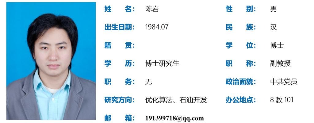 陈岩,男,1984年07月出生,博士研究生,副教授。主要研究方向最优化理论与算法、油藏数值模拟和渗流力学等;主持省部级项目2项、油田科研项目8项;参与科研项目10余项;发表学术论文20余篇,被SCI、EI、ISTP三大检索收录8篇;授权发明专利1项;出版专著1部;获得省部级科技进步奖2项、厅局级科技创新奖1项。