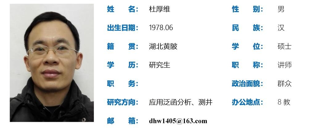 2002年本科毕业于华中师范大学数学系,2011年硕士毕业于成都理工大学管理学院应用泛函分析方向。2002年至今在sunbet申搏官方网站任教,主讲高等数学、点集拓扑等课程。主要研究方向:应用泛函分析、地球物理测井;参与横向项目3项,纵向项目1项;发表学术论文10余篇,含SCI两篇;2021年授权国家发明专利一项;2023年主编教材《大学数学教程》,由科学出版社出版;近10年指导学生参加全国大学生数学竞赛,获一等奖、二等奖、三等奖多项,并获评全国大学生数学竞赛优秀指导教师。