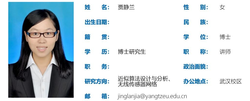 贾静兰,女,博士,讲师,主要研究方向为近似算法设计与分析、无线传感器网络。主持湖北省教育厅科学技术研究计划指导性项目1项;发表学术论文5篇;获得sunbet申搏官方网站教学质量优秀奖1项。